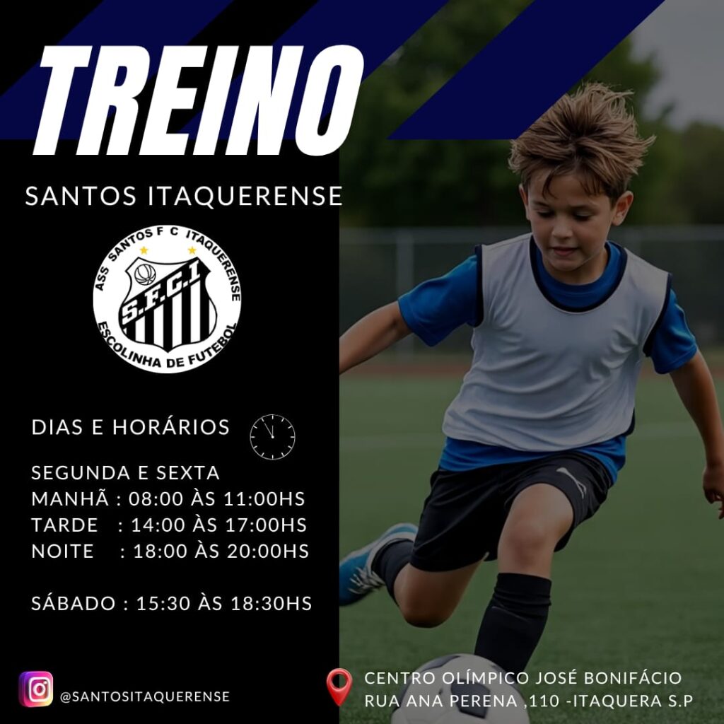 Segundas e Sextas Feira: Treinos nos horários (08:00 – 14:00 e ás 18:00) – Sábados às 15:30 hs. Procure um professor e realize sua inscrição – Vem para o Santos Itaquerense!